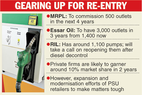New Delhi, Oct. 5: Reliance Industries, Essar Oil and Mangalore Refinery and Petrochemicals Ltd (MRPL) are planning to re-enter fuel retailing as diesel decontrol appears imminent.