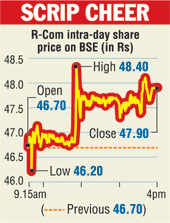 The R-Com scrip rose 2.57 per cent to Rs 47.90 on the BSE after the announcement. Intra-day, it surged 3.64 per cent to Rs 48.40.