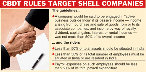 On Tuesday, the Central Board of Direct Taxes (CBDT) came out with the eagerly awaited guidelines to clear the air by stating that a company would be said to be engaged in "active business outside India" if its passive income - that is, income arising from purchase and sale of goods from or to its associate companies, and income by way of royalty, dividend, capital gains, interest or rental incomes - was not more than 50 per cent of its overall income.
