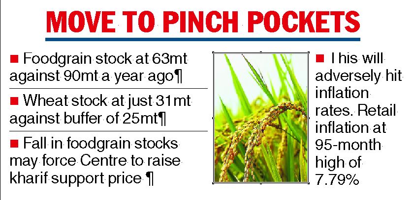 Food grain stocks at the beginning of this month stood at 63.47 million tonnes (mt) against 90.21mt a year ago.