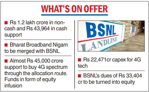 Telecom minister Ashwini Vaishnaw said the package has a cash component of Rs 43,964 crore and a non-cash component of Rs 1.2 lakh crore spread over four years. “We are committed to strengthening BSNL,” he said. Funds will be provided to upgrade services, allocate spectrum, de-stress the balance sheet and augment the fiber network by merging Bharat Broadband Nigam Ltd (BBNL) with BSNL.