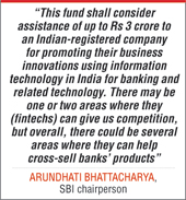 "This fund shall consider assistance of up to Rs 3 crore to an Indian-registered company for promoting their business innovations using information technology in India for banking and related technology," SBI chairperson Arundhati Bhattacharya said at a CII event in Mumbai today, PTI reported.