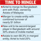 The merged entity will own around 30 per cent of the Bangladesh mobile market, making it the second-largest operator in that country.