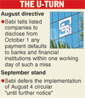 Mumbai, Sept. 30: Market regulator Sebi has deferred the implementation of its directive that required listed firms to inform stock exchanges if they defaulted on loan repayments to banks and financial institutions.