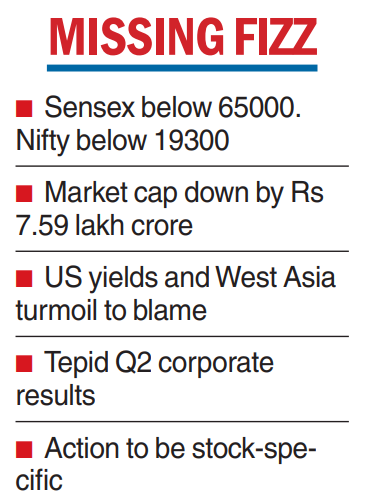 The festive spirit was missing in the stock markets as firm US treasury yields and heightened tensions in West Asia saw the benchmark Sensex crashing nearly 826 points to fall below the 65000 mark whereas the broader Nifty settled below 19300, even as investor wealth took a knock of Rs 7.59 lakh crore.