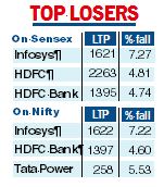 Infosys was the top loser in the Sensex pack, plummeting 7.27 per cent. HDFC Bank lost 4.74 per cent.