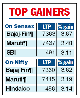 The 30-share Sensex, which began the day in green at 58158.56, hit an intra-day high of 58702.65 — a gain of 1069 points. It later settled at 58649.68, thus showing a rise of 1016.03 points. In two days, the index has jumped over 1900 points. Similarly, the Nifty ended at 17469.75 — higher by 293.05 points. Shares of Bajaj Finance gained the most in the Sensex stocks as it shot up by 3.67 per cent to Rs 7,363.45.