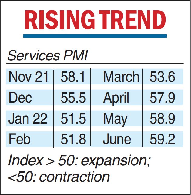The seasonally adjusted S&P Global India Services PMI Business Activity Index rose to 59.2 in June from 58.9 in May — the highest since April 2011.The services sector witnessed an expansion in output for the eleventh straight month.