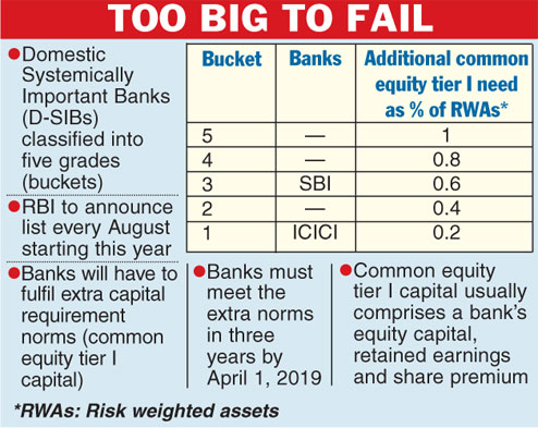 The RBI had in July last year released the framework to deal with D-SIBs in India. According to this framework, the RBI will disclose the names of banks designated as D-SIBs every year in August starting from this year. Though the apex bank was expected to name 5-6 banks as D-SIBs, it only named two. Banking circles expect the number to go up next year.