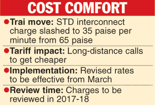 New Delhi, Feb. 24: Long-distance calls are set to become cheaper with telecom regulator Trai slashing STD interconnect charge by 50 per cent to 35 paise per minute from 65 paise.