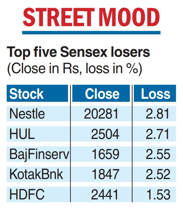 Nestle India was the top loser in the Sensex pack, slipping 2.81 per cent, followed by Hindustan Unilever, Bajaj Finserv, Kotak Mahindra Bank, HDFC, RIL, Bajaj Finance and Asian Paints.