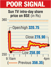 Mumbai, June 8: Shares of Sun TV Network today crashed nearly 22 per cent on reports that the home ministry had turned down a proposal to give security clearances to its television channels. The move could lead to a cancellation of their broadcasting licences and these channels could go off-air.