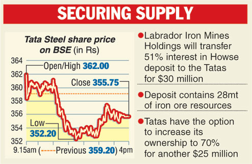 Mumbai, March 12: Tata Steel Ltd has entered into an arrangement with Labrador Iron Mines Holdings Ltd (LIM) of Canada under which the latter will transfer 51 per cent in an iron ore deposit to a Tata Steel subsidiary for Canadian $30 million.
