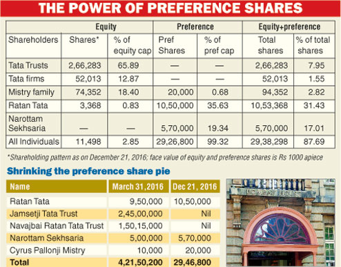 By March 2016, the total number of preference shares issued had swelled to more than 4.21 crore with the two Tata trusts - Jamsetji Tata Trust and Navajbai Ratan Tata Trust - holding the bulk of the shares issued at 3.95 crore.