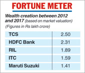 Creating wealth worth about Rs 1.89 lakh crore, Reliance Industries muscled its way to the third spot after not featuring on the list in the previous study. ITC (Rs 1.59 lakh crore) and Maruti Suzuki (Rs 1.41 lakh crore) took the fourth and fifth rank on the list.