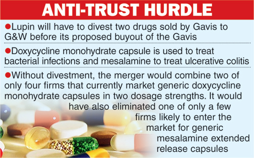 Mumbai, Feb. 20: Lupin will have to divest two drugs sold by Gavis Pharmaceuticals LLC to settle anti-trust charges ahead of its proposed acquisition of the latter.