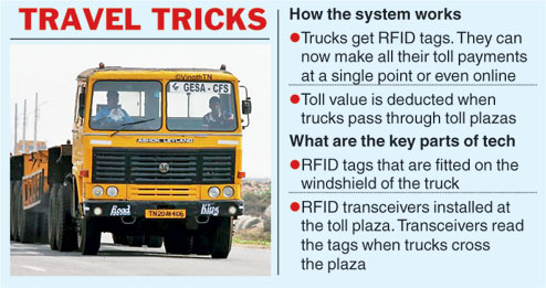 Under the system, a tag — priced between Rs 50 and Rs 70 — is fitted in the truck. The owner can put in whatever amount of money he wants at dedicated booths, or even online, and the toll value is deducted when the truck passes through sensors on toll-plazas.