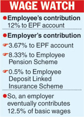 At present, employees and employers contribute 12 per cent of basic wages each towards the Employees' Provident Fund Scheme (EPF), the Employee Pension Scheme (EPS) and the Employee Deposit Linked Insurance Scheme (EDLI).