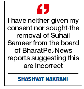 “I have neither given my consent nor sought the removal of Suhail Sameer from the board of BharatPe. News reports suggesting this are incorrect… I can confirm that I was one of the two joint nominees in the appointment resolution of Suhail Sameer as the CEO and Board member of BharatPe, and he continues to enjoy my support,’’ PTI quoted Nakrani as saying.