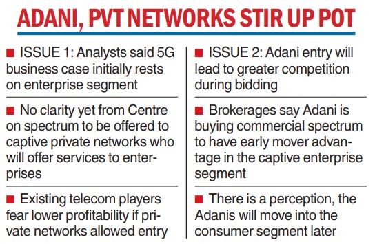 Analysts said the entry of Adani will impact the bidding strategies of Reliance Jio, Bharti Airtel and Vodafone. The DoT plans to release the earnest money deposited by the four bidders this week, which will give some idea about the bids. However, there is little clarity on the band and the amount of spectrum to be allocated to the private networks.