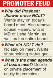 The immediate provocation to this latest bout is a board meeting slated tomorrow to consider raising equity capital by private placement to the promoters. Prashant and his father Basant K. Jhawar wanted stay on the meeting.