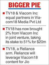 TV18, a Reliance Industries arm, will buy one per cent in Viacom18 Media Pvt Ltd for $20 million that will increase its stake to 51 per cent and gives Ambani the leverage to offer a wider range of content to more than 160 million subscribers of Jio.
