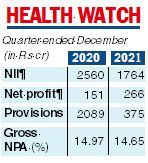 Provisions fell 82 per cent to Rs 375 crore from Rs 2,089 crore in the previous year period. Analysts had expected the bank to report a net profit of around Rs 150 crore.