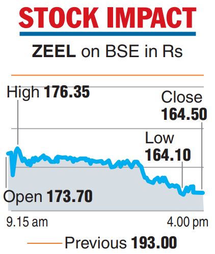 The ZEEL stock closed at Rs 164.50 on the BSE, down 14.77 per cent; on the NSE, it fell 14.02 per cent to Rs 165.65. The stock hit a low of Rs 163.75 and Rs 164.10 — its lower circuit limit — on the NSE and the BSE, respectively.