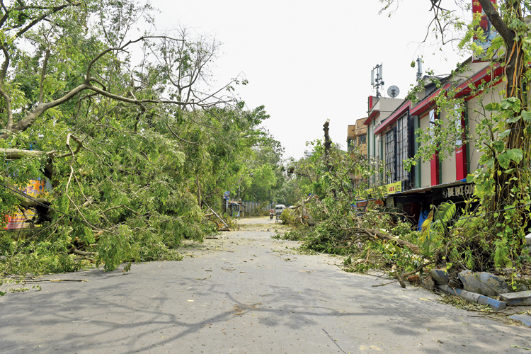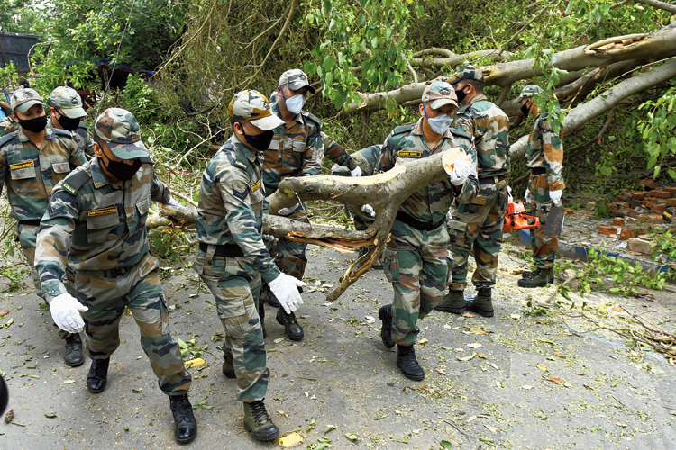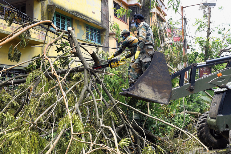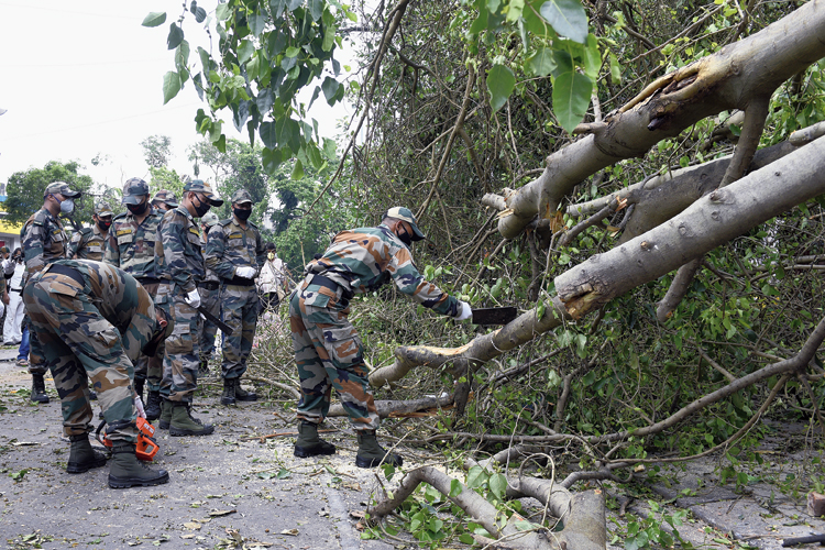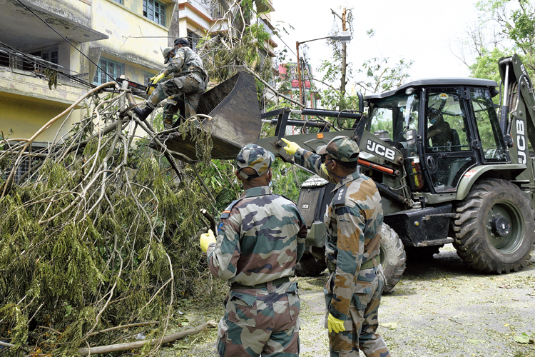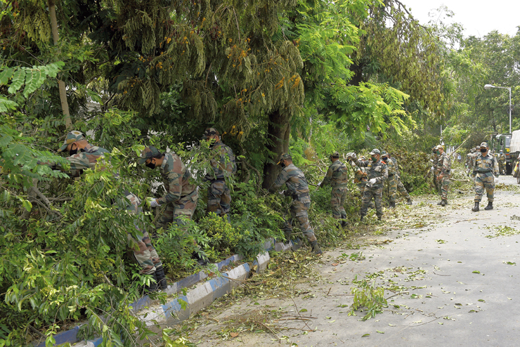 The men in uniform and their machines hack away at the uprooted trees, carve a path and leave, mission accomplished