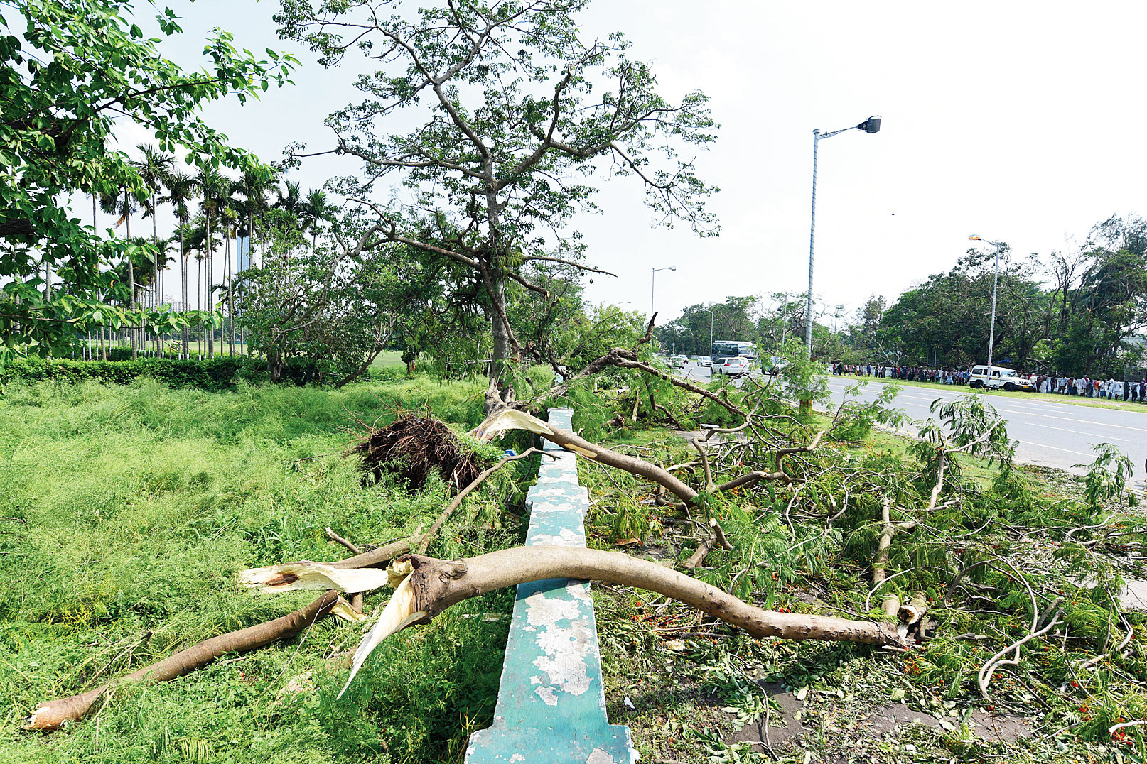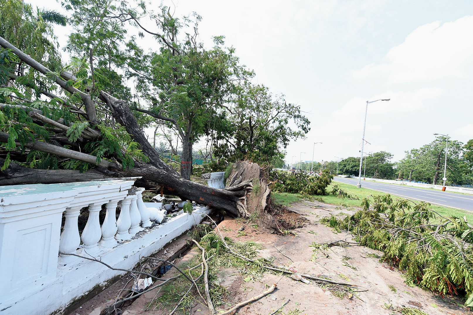Uprooted trees pockmark one flank of Red Road, one of the most picturesque and historical stretches of Calcutta, on Friday. Even three days after Cyclone Amphan struck, during which some of the debris has been cleared, the margins of the road bear the marks of the merciless assault.