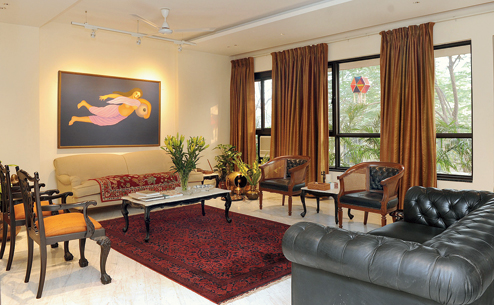Behind a comfortable couch is a painting by Bawa of a mythical woman inspired by the legend of Sohni. Another huge work by Bawa of a Krishna-like cowherd with a cow and a bird, is displayed on the adjacent wall.