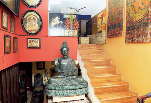 “We didn’t hire an interior designer or contractor to renovate the house. It has taken shape organically,” says Harpreet.The front door opens onto a vibrant landing that gives one a hint of what lies inside. Antique Tanjore paintings and arresting hues make you do a double take. Stairs from the landing lead down to the lower ground floor while another, smaller flight goes to the upper ground floor.