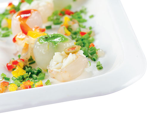 The chef suggests that while lychees are still around, you could serve — or eat — different kinds of lychee canapés. Cut a peeled lychee into two, remove the seed, lightly mix the fruit halves with Cajun spices and then fill the cavity with anything — from chopped boiled eggs and boiled prawns (with chopped green chillies and spring onions) and coriander chutney to finely chopped chicken in Thai curry sauce, Szechuan whole American corn, Mexican