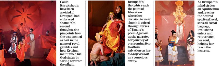 While Banani Chakraborty was Prakshana, Adreeta Chatterjee was Draupadi and Ekavali Khanna Yuvati. Kalamandalam Sucheendranathan, Jayeeta Ghosh Raha and many artistes from West Bengal and Kerala collaborated. Dinesh Poddar took care of lights and Jaydeep Sinha vocals. Kabir Bedi lent his voice for the narration while Debojyoti Mishra curated the soundscape. The Telegraph was in the audience.