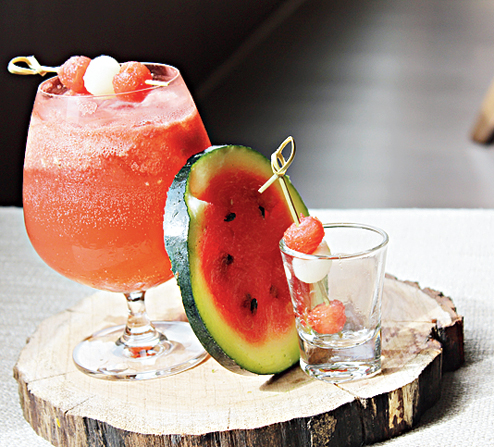 ♦5-6 watermelon chunks ♦ 30ml Framboise (raspberry liqueur) ♦ 1 tsp castor sugar ♦ 250ml Budweiser beer ♦ Watermelon balls for garnish