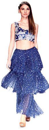 Kavita Bhartia however has paired them with different kinds of skirts. Her trimmed tops have been detailed with delicate embroidery and sequin-work for a distinctly feminine feel. Similarly, a blend of east and West is also visible in Deepika Govind’s creations. “Crop tops are associated with Western silhouettes. But I teamed them with long skirts inspired partly by dresses worn by Greek goddesses and to some extent by the sari drape,” says Govind.