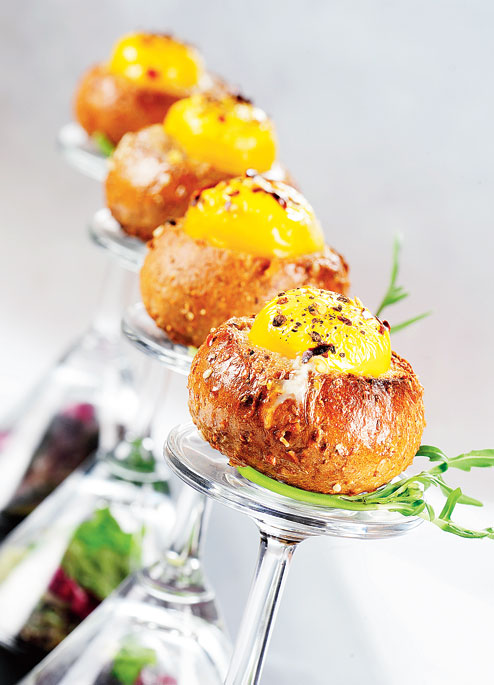 Chef Mohanta does oeufs en cocotte — or eggs in a pot. But while the traditional dish is an egg cooked in cream or butter in a small ramekin, hers is a variation in which the egg is cooked in beer dough rolls with cheese, olive and herbs.