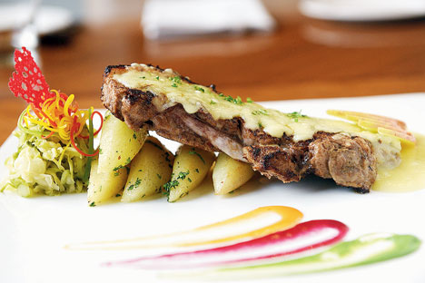 Ripple (Pork Chops) is a standout dish on the menu. The pork chops that have a fine ratio of meat and fat are first marinated with olive oil, rosemary and garlic paste and then grilled. The pork chops are layered with Swiss cheese and baked for 20 minutes till the cheese melts and the pork is tender. Apple sauce is then drizzled on top. The main course is accompanied by grilled potatoes and sauerkraut. Rs 825