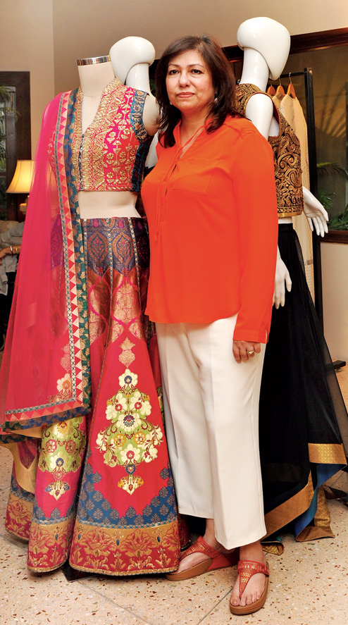 Singh’s festive collection is offering long, layered jackets, angarkhas, waistcoats, cholis, tunics and draped tops which are teamed with lehenga skirts, wraparound (pre-stitched) saris, sarong dhotis, shararas, flowing trousers and palazzos. The designer has worked on a lot of separates as well. She says: “A short blouse from the collection can be paired with a sari or with a skirt. The idea is to let the wearer create her own ensemble.”