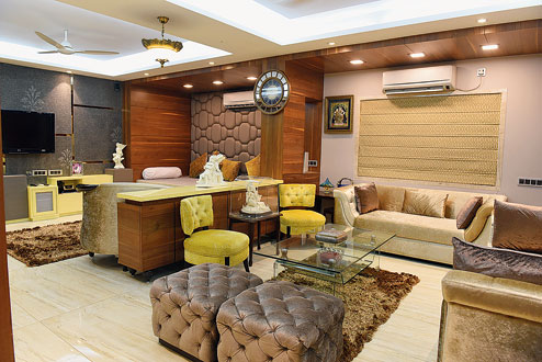 Comfortable sofas in gold, beige and metallic brown give a warm look to the drawing room. The television set here is used by the family for karaoke evenings. “This is one thing that all of us look forward to,” says Shasank, a chartered accountant.