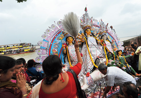 ‘Theme pandals’ are the biggest draws and there’s hardly any edifice or heritage site that hasn’t been displayed: from temples and churches of every land to the Eiffel Tower. Mountains are literally ‘assembled’ and even caves like Ajanta or Amarnath created with superb craftsmanship. The Titanic was in Calcutta when the film broke international records, as were the dinosaurs when Spielberg’s Jurassic Park rocked the movie halls.