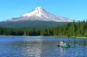 | (From top): Boating at the base of Mount Hood; a view of Portland city with Mount Hood in the background; a wedding party walks through a park in historic downtown Portland; Portland’s MAX light rail runs through the ibrant downtown area; the 36-foot tall statue of Portlandia |