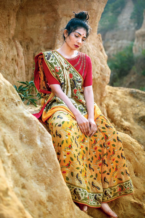 Currently, our collection includes a lot of Benarasi meenakari bandhni, where zari and resham threads are woven together for the embellishment, alongside the bandhni. The motifs and designs are all inspired by nature, to give it a contemporary yet traditional look. All our pieces are passed down generations and hold a strong emotional value.