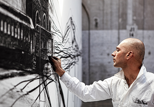 Perhaps it’s more complicated than that. Drawing is the backbone of what he does, harnessing the mood, aesthetic control, dexterity and composure of a painter. But he turns the act of drawing into a remarkably complex performance, with site-specific installations using props, costumes, lighting and sound and elements of theatre — these are made complete with his incredibly alive drawings and paintings. Chopra calls himself “a painter who makes performance installations”. One critic has described his work as being, “at the boundaries between theatre, performance, live art, painting, photography and sculpture”.