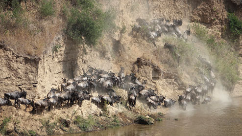 Thousands of wildebeest jump into the swift currents with a single thought in mind — The Grass is Greener On The Other Side. The careful start soon turns into chaos, bustling with animals, amid the sand and water. In their haste, wildebeest often jump off high cliffs to their death or injury. They face the greatest danger from the scores of hungry crocodiles, waiting in the tumultuous waters. And hippos — though not predators — are unpredictable and react violently when disturbed.