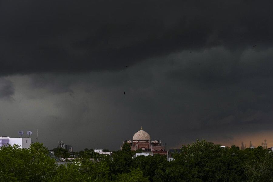 Dense dark cloud blanketed the national capital on Tuesday as early October rain brought down the mercury by several notches after a hot weekend. However, the downpour also sharply reduced visibility and caused traffic jams and waterlogging in several areas.