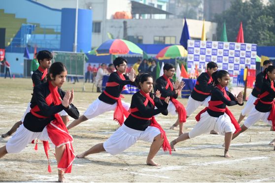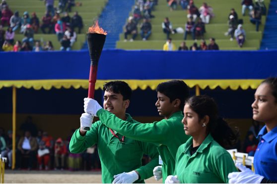 The event began with the Principal, Madam Reshma Bhattacharya, addressing the gathering and highlighting the significance of sports as an integral part of holistic education. Following the address, she along with the CEO Mr. S.L. Gupta and the leadership team extended a warm welcome to the guests and felicitated them with mementoes as a token of gratitude. The school flag that embodied the values and principles of the school was unfurled by Brigadier Chaudhury while the March Past was a spectacle of precision and pride, with the four Houses striding across the field in perfect synchrony, flags fluttering high, steps echoing determination. The students' sense of teamwork and coordination was evident in their marching steps, setting the tone for the rest of the sporting events. After the taking of the oath by the School Captain, Kanishk Hela, and the opening address by the Chief Guest, Sports Day was officially declared open.