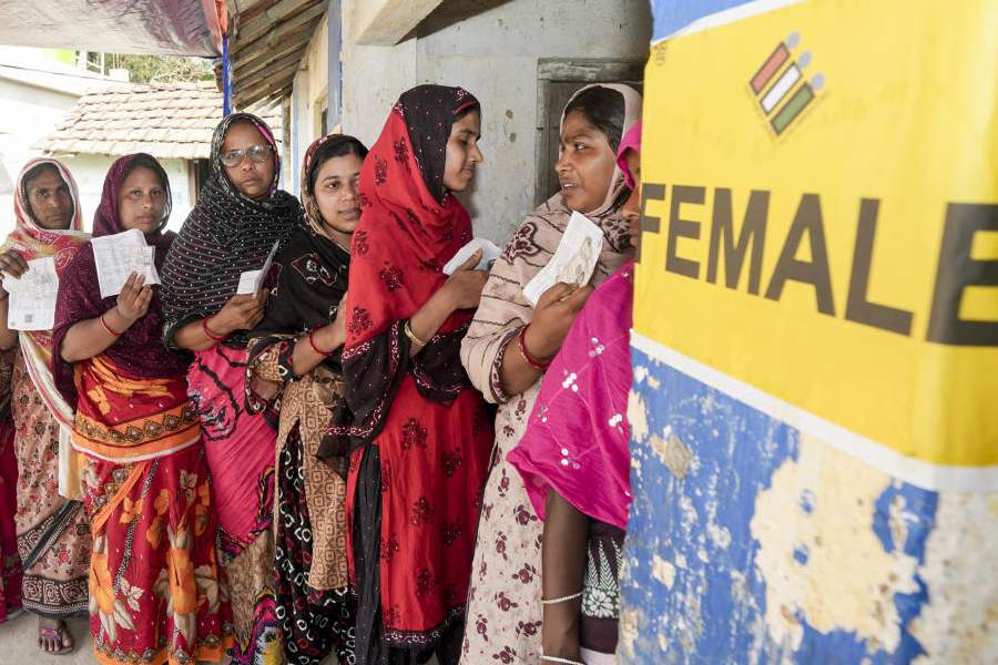 People wait in a queue to cast votes during the first phase of the West Bengal Assembly election, in Nandigram, Purba Medinipur district, Thursday, April 23, 2026.