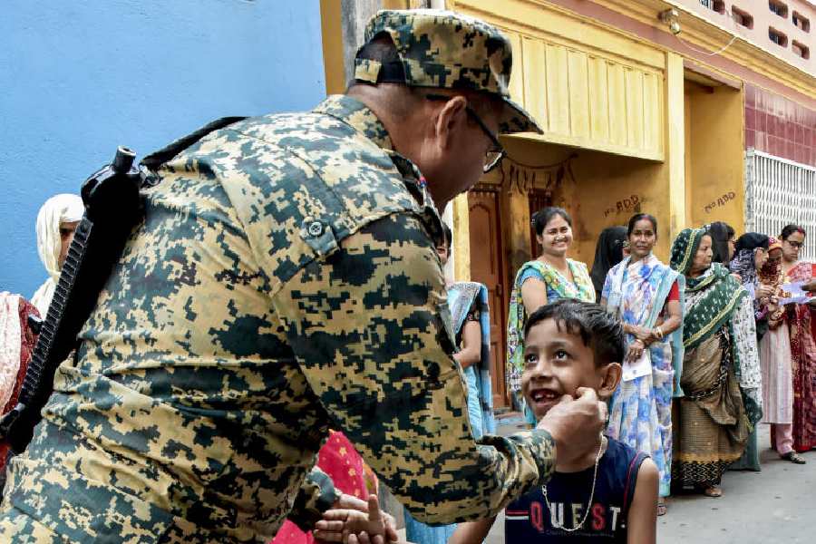 A security official embraces a young boy at a polling station during the first phase of the West Bengal Assembly elections, in Murshidabad district, Thursday, April 23, 2026.