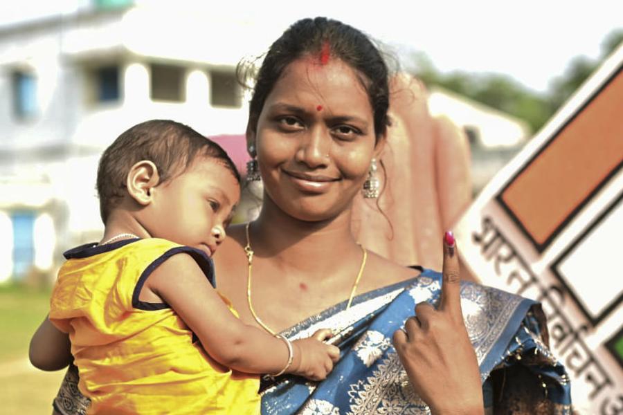 In this image posted on April 23, 2026, A voter holding a child shows her ink-marked finger after casting her vote in the first phase of West Bengal Assembly elections, in Jhargram district.